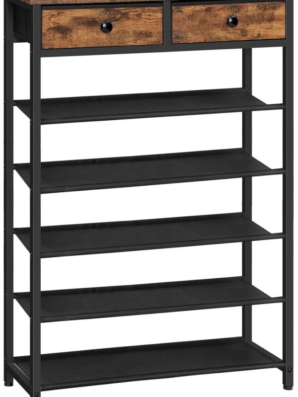 Shoe Rack, 6 Tier Shoe Storage Organizer with 2 Non-Woven Drawers, 15-20 Pairs of Shoes for Entryway, Shoe Shelf with 5 Oxford Fabric Shelves and Wooden Top, Closet, Rustic Brown BF79XJ01