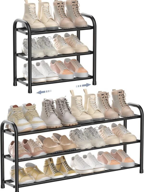 Expandable Shoe Rack, 3 Tier Adjustable Shoe Organizer Shelf for Closet, Black Metal Free Standing Shoe Rack Storage for Small Space, Entryway