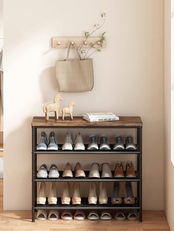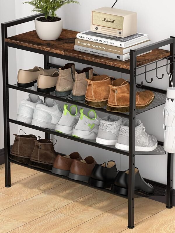 Shoe Rack for Front Door Entrance, 4 Tier Height-Adjustable Metal Shoe Rack, Sturdy Wooden Top and Tiltable Steel Frame Heavy Duty Shoe Organizer for Bathroom,Bedroom,Kitchen,Include Hook