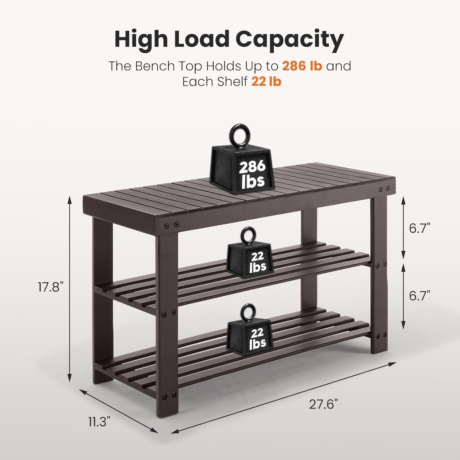 - 【Strong & Spacious Design】Measuring 11.3″D x 27.6″W x 17.8″H, the bench supports up to 286 lbs on the top seat, making it ideal for most adults. Each lower shelf can hold up to 22 lbs—perfect for shoes, bags, baskets, or other household essentials.