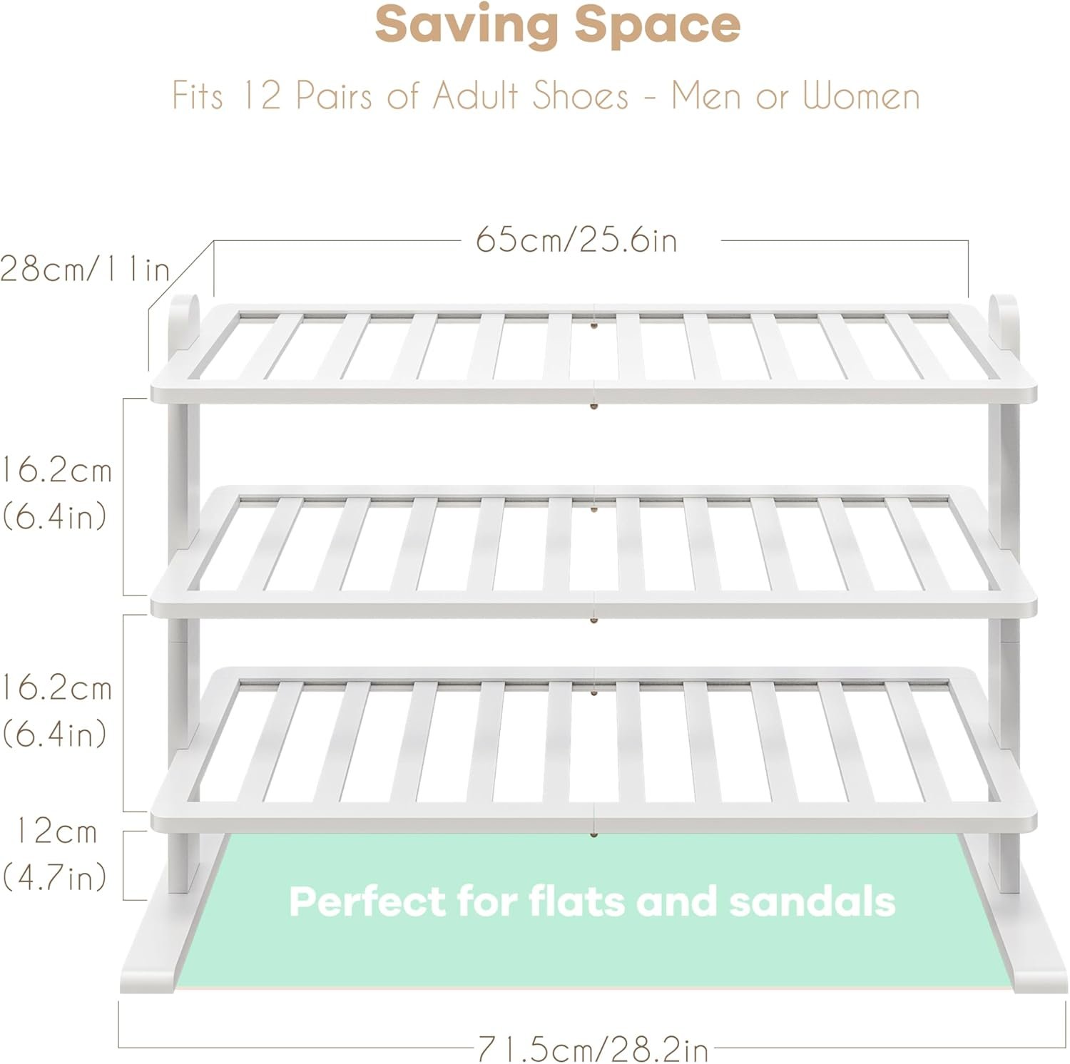 • Organize 12 Pairs of Shoes – With each tier measuring 26.5 inches in length, a 6.4-inch gap between them, and the first tier standing 4.7 inches from the floor, this shoe rack organizer provides four tiers for organizing 12 pairs of adult shoes. Additionally, you can place one shoe facing forward and one backward in each pair, expanding the shoe shelf’s capacity to accommodate 16 pairs of women’s shoes.